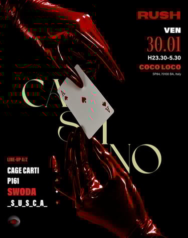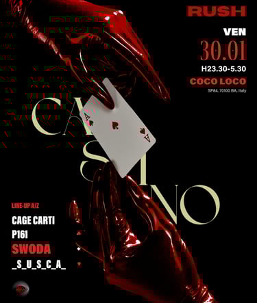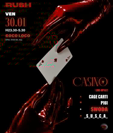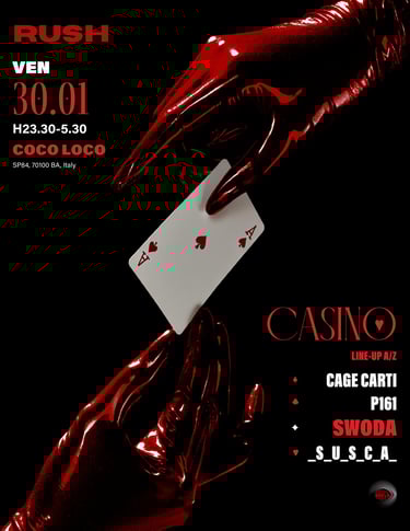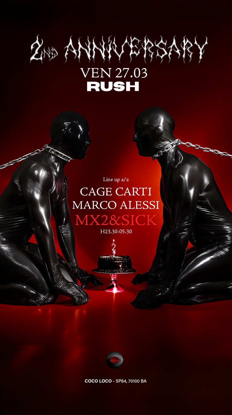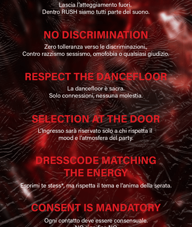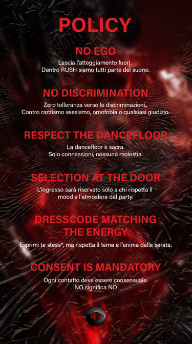 Rush System is a Techno reality based in Bari that organizes events in order to bring the Techno world in a city where it was never possible to establish it.